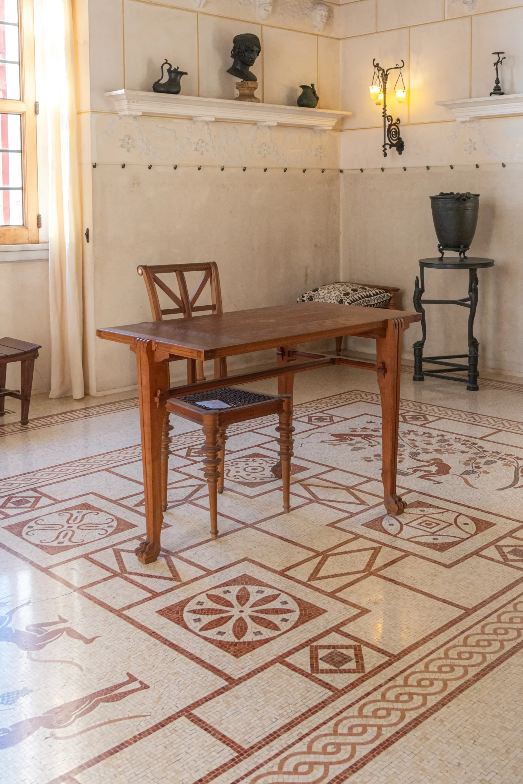 Le mobilier a été confié à l’ébéniste Louis François Bettenfeld qui réalisa des pièces sur mesure selon des formes attestées dans le monde grec. Bois précieux bronzes et marbres sont utilisés pour évoquer les matières et les savoir faire de l’époque hellénistique tout en répondant au confort du début du XXe siècle. Les meubles ne décorent pas seulement les espaces ils en définissent l’usage et accompagnent la fonction de chaque pièce. Théodore Reinach supervisait personnellement la fabrication et rendait régulièrement visite aux ateliers afin de contrôler l’exactitude