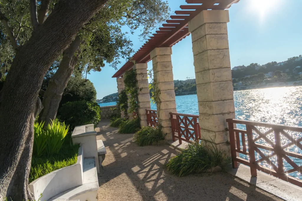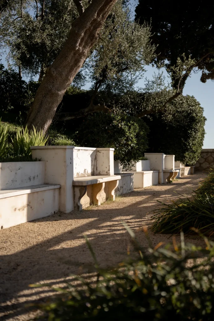 Pensés dès l’origine comme partie intégrante du projet, ces jardins mêlent des essences typiques oliviers, vignes, grenadiers, caroubiers , aux arbres méditerranéens , pins, cyprès, palmiers, tandis que la palette végétale l’enrichit de lauriers-roses, iris, myrtes, et de touches exotiques comme le papyrus.